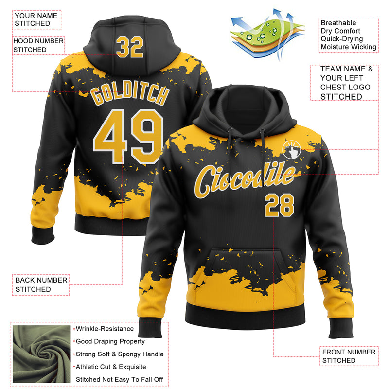 Custom Stitched Black Gold-White Fragment Pattern Sports Pullover Sweatshirt Hoodie