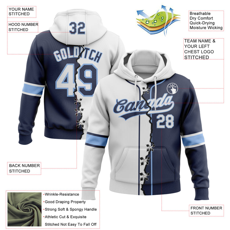 Custom Navy White-Light Blue Split Ripped Pattern Baseball Pullover Sweatshirt Hoodie