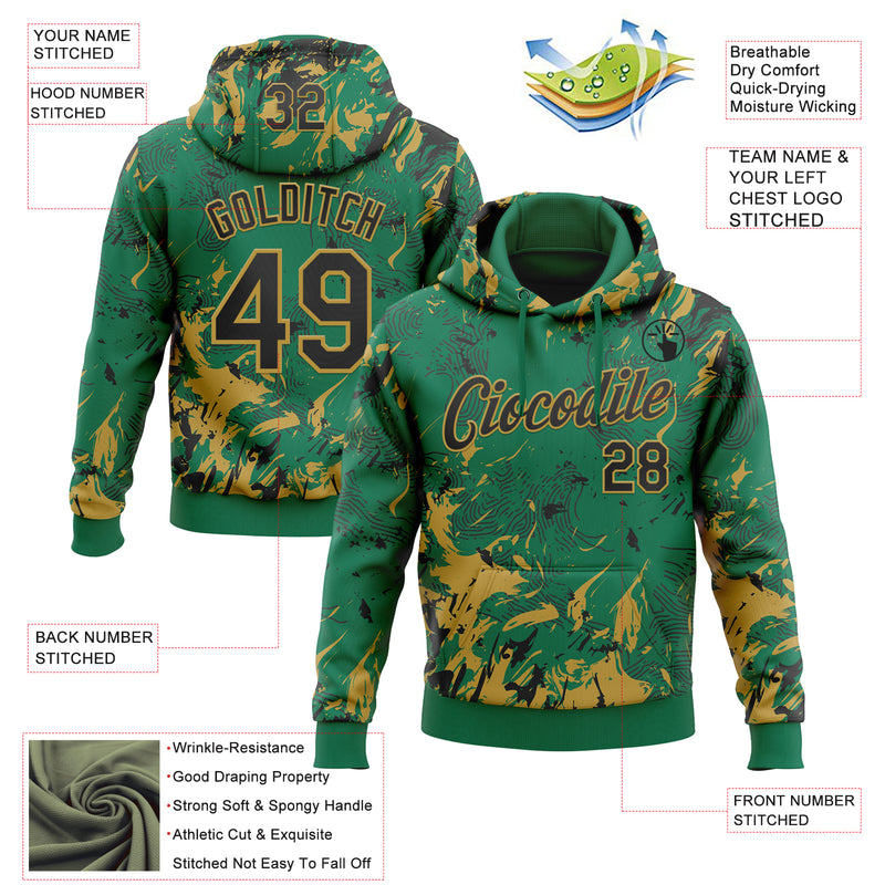 Custom Stitched Kelly Green Black-Old Gold Splash Sports Pullover Sweatshirt Hoodie