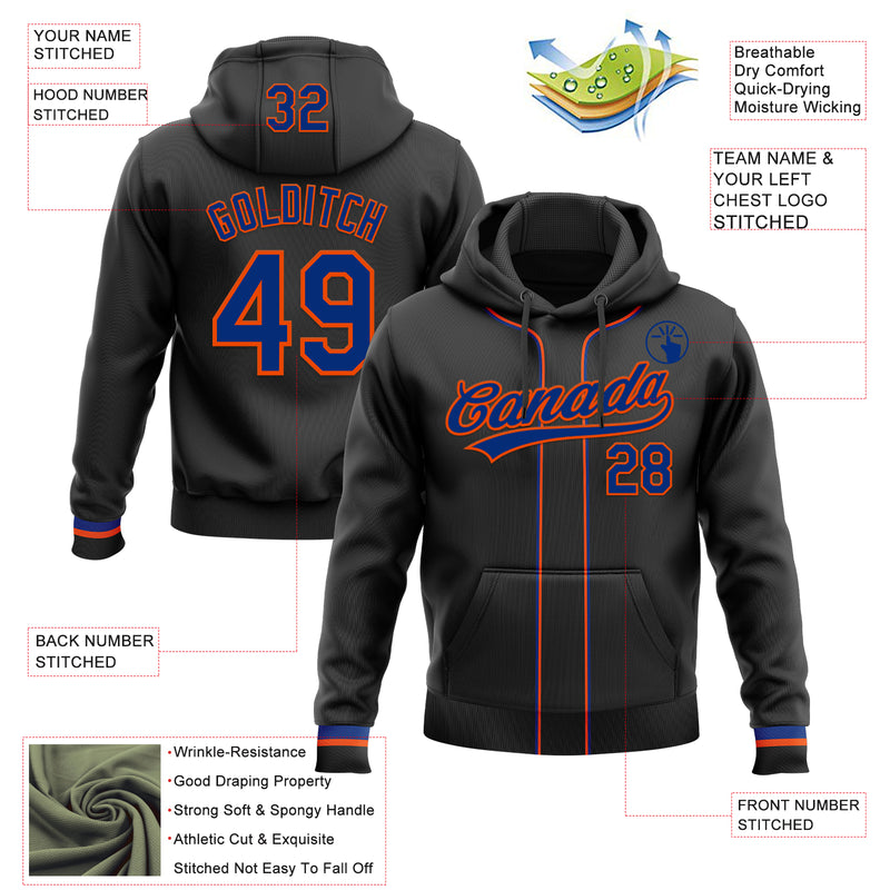 Custom Stitched Black Royal-Orange Baseball Pullover Sweatshirt Hoodie