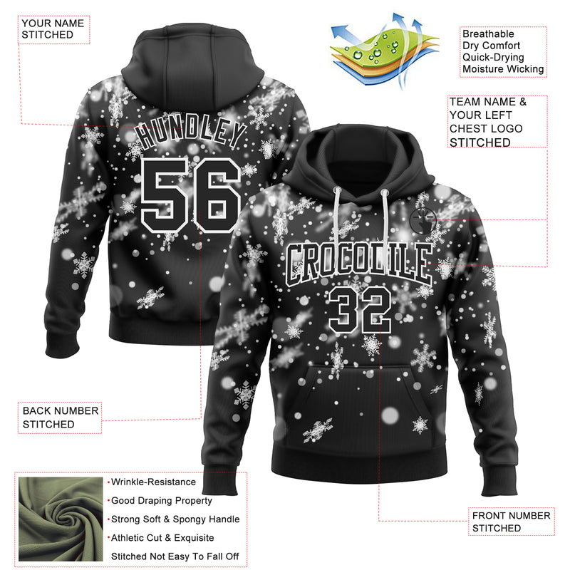 Custom Stitched Black White Christmas Snowflakes 3D Sports Pullover Sweatshirt Hoodie
