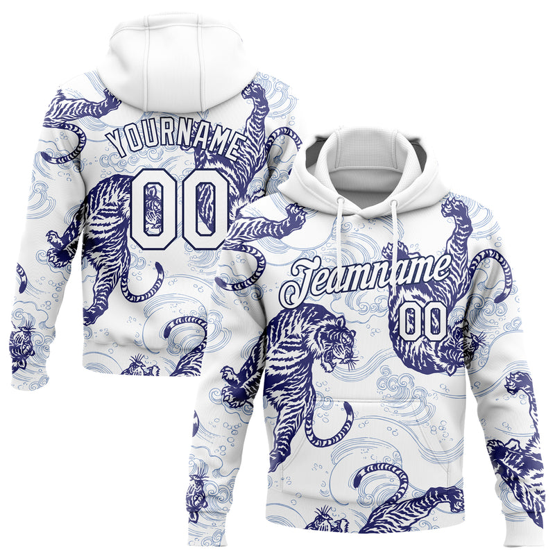Custom Stitched White Navy 3D Pattern Design Tiger Sports Pullover Sweatshirt Hoodie