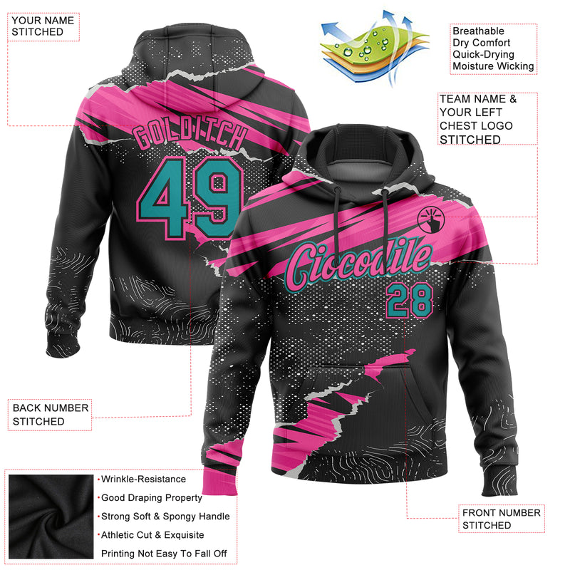 Custom Stitched Black Teal-Pink 3D Pattern Design Torn Paper Style Sports Pullover Sweatshirt Hoodie