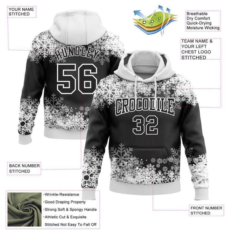 Custom Stitched Black White Christmas Snowflakes 3D Sports Pullover Sweatshirt Hoodie