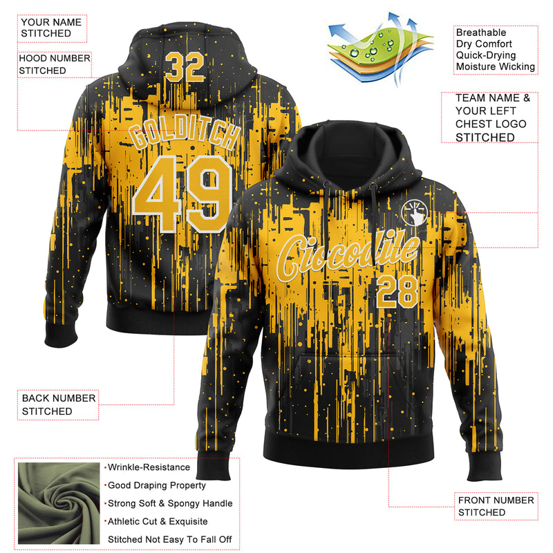 Custom Stitched Black Gold-White Dripping Splatter Sports Pullover Sweatshirt Hoodie