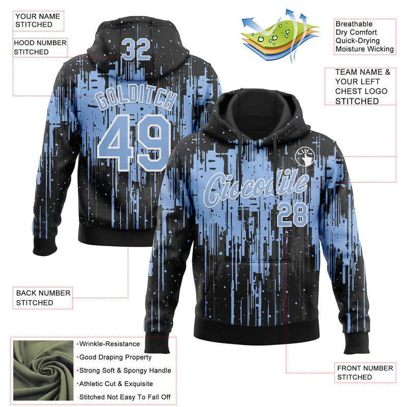 Custom Stitched Black Light Blue-White Dripping Splatter Sports Pullover Sweatshirt Hoodie