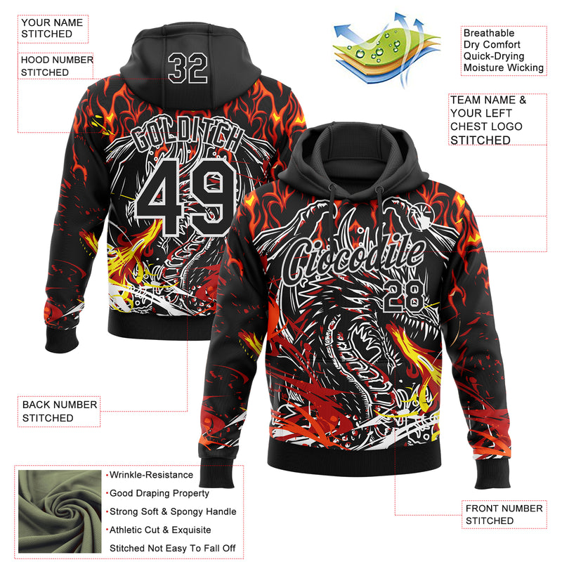 Custom Stitched Black Red Yellow-White 3D Pattern Design Flame Dragon Sports Pullover Sweatshirt Hoodie