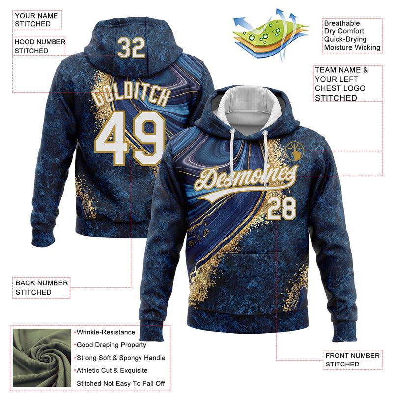 Custom Stitched Navy White-Old Gold Abstract Marble Sports Pullover Sweatshirt Hoodie