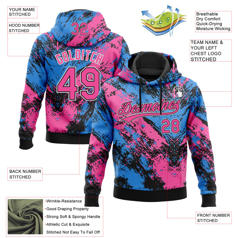 Custom Stitched Black Pink Powder Blue-White Abstract Splatter Sports Pullover Sweatshirt Hoodie