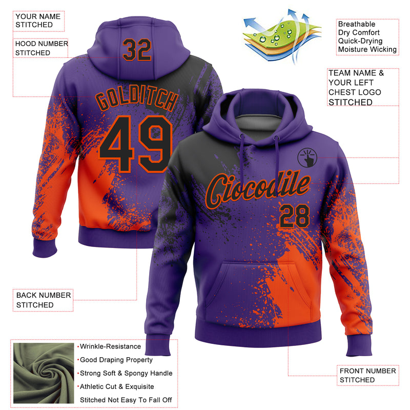 Custom Stitched Purple Black-Orange 3D Pattern Design Abstract Brush Stroke Sports Pullover Sweatshirt Hoodie