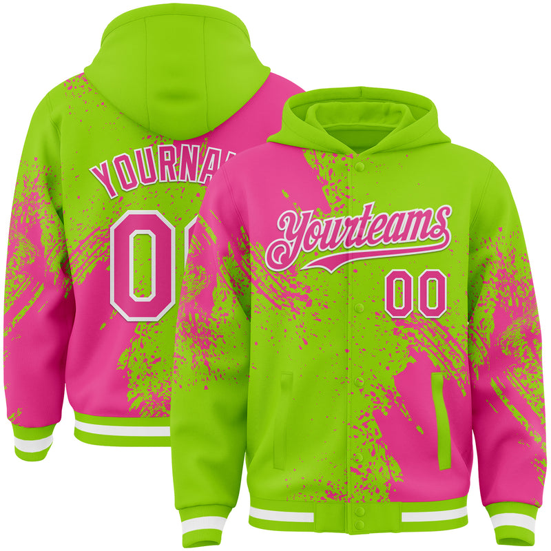 Custom Neon Green Pink-White Abstract Brush Stroke 3D Pattern Design Bomber Full-Snap Varsity Letterman Hoodie Jacket