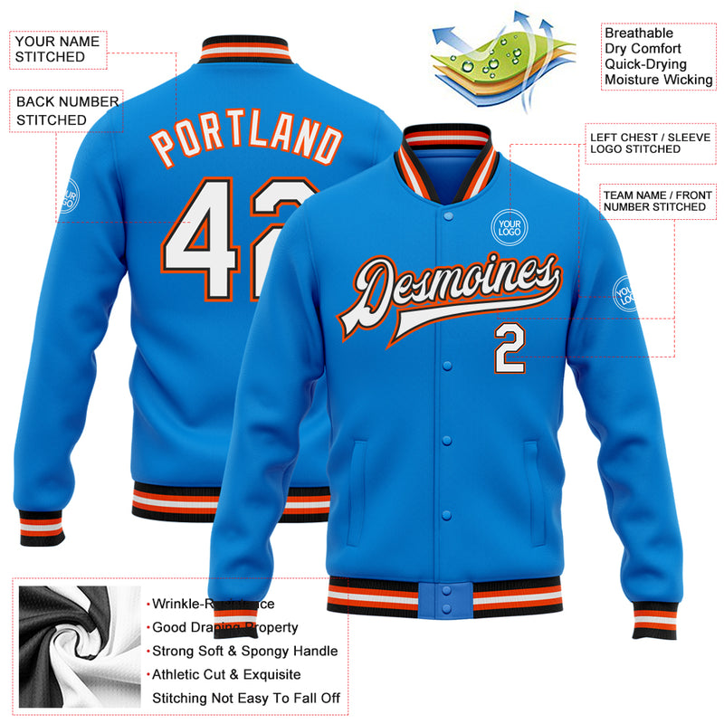 Custom Powder Blue White Black-Orange Bomber Full-Snap Varsity Letterman Jacket