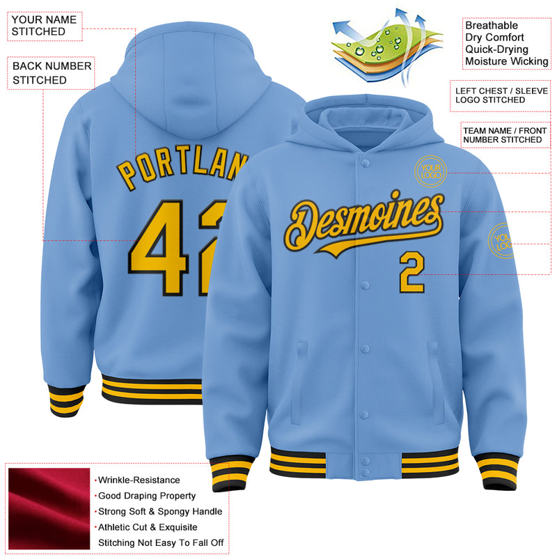 Custom Light Blue Gold-Black Bomber Full-Snap Varsity Letterman Hoodie Jacket