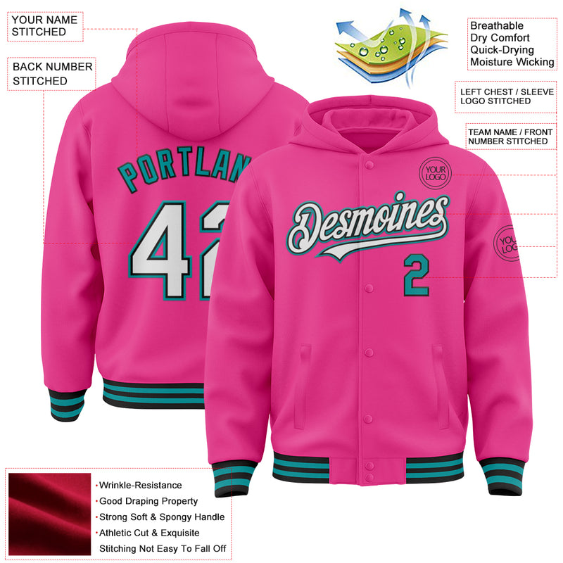 Custom Pink Black-Teal Bomber Full-Snap Varsity Letterman Hoodie Jacket
