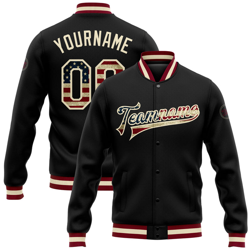 Custom Black Vintage USA Flag-Cream Bomber Full-Snap Varsity Letterman Jacket