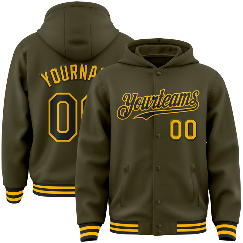 Custom Olive Black-Gold Bomber Full-Snap Varsity Letterman Salute To Service Hoodie Jacket