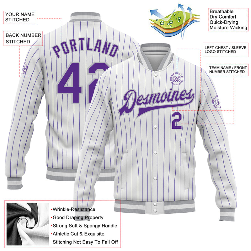 Custom White Purple Pinstripe Gray Bomber Full-Snap Varsity Letterman Jacket