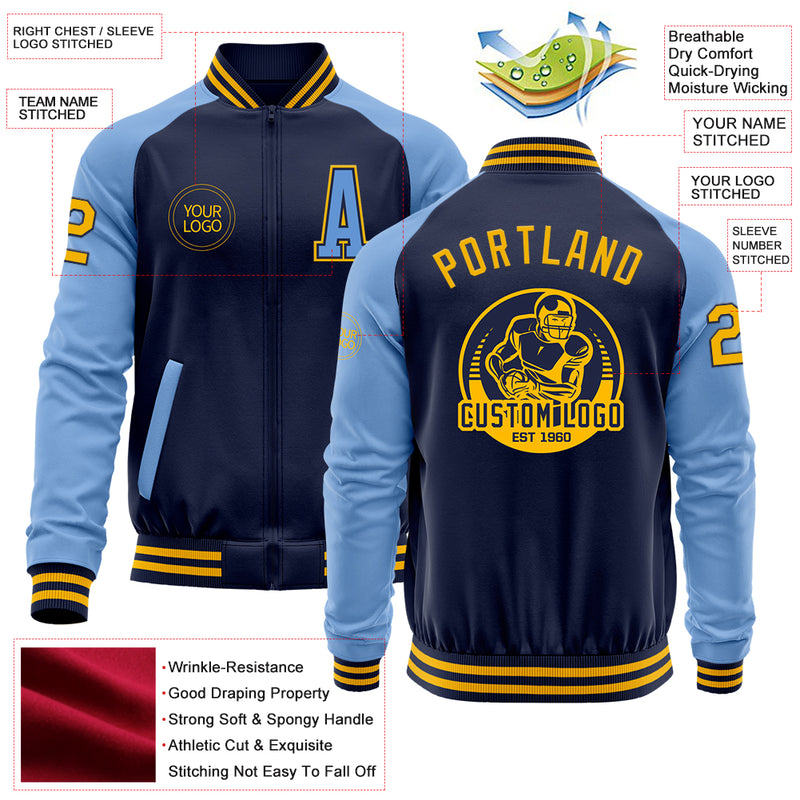 Custom Navy Gold-Light Blue Bomber Varsity Letterman Two Tone Zipper Jacket