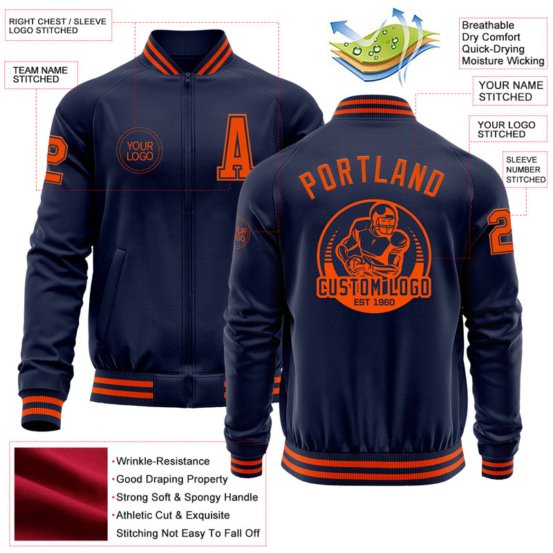 Custom Navy Orange Bomber Varsity Letterman Zipper Jacket