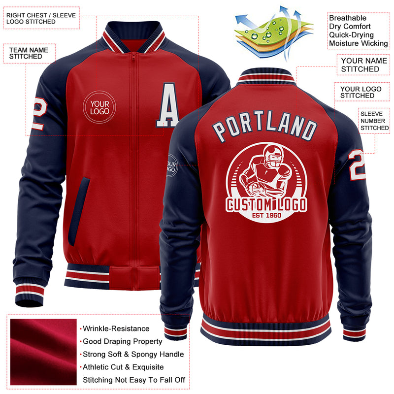 Custom Red White-Navy Bomber Varsity Letterman Two Tone Zipper Jacket