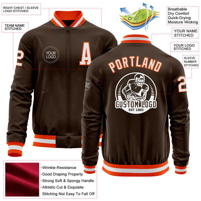 Custom Brown White-Orange Bomber Varsity Letterman Zipper Jacket