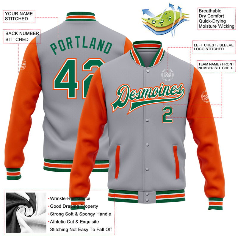 Custom Gray Kelly Green-Orange Bomber Full-Snap Varsity Letterman Two Tone Jacket