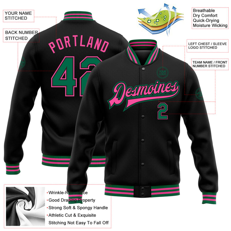 Custom Black Kelly Green-Pink Bomber Full-Snap Varsity Letterman Jacket