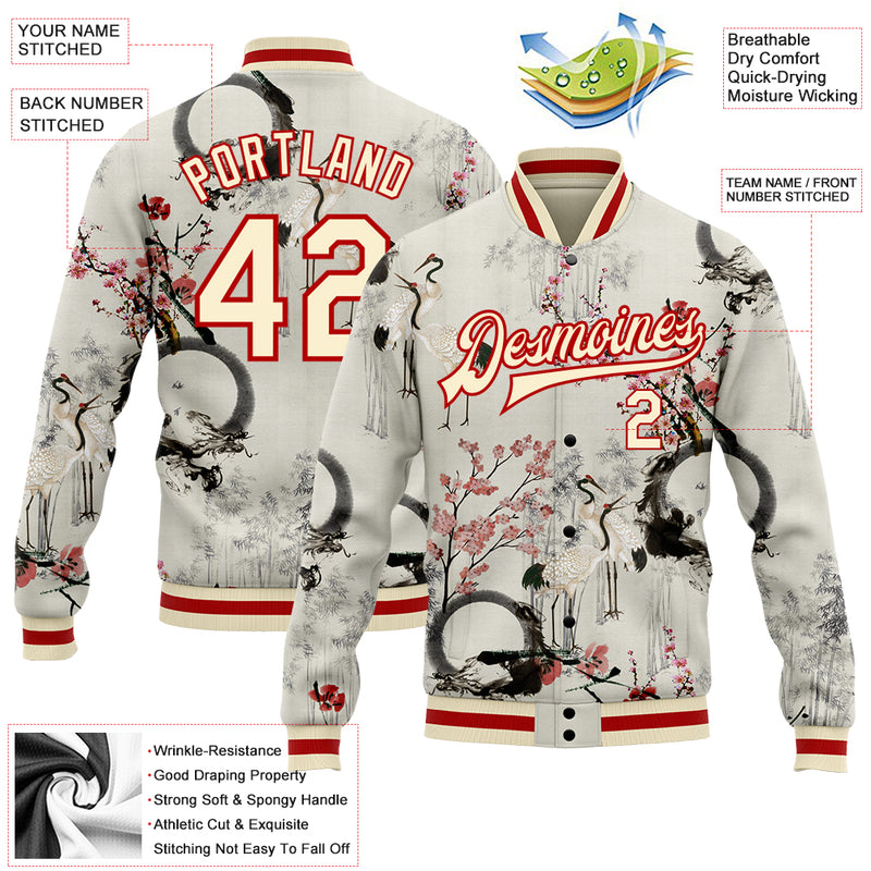 Custom Cream Red Heron And Flower 3D Pattern Design Bomber Full-Snap Varsity Letterman Jacket