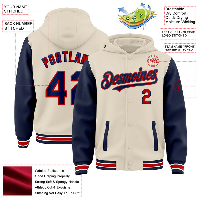 Custom Cream Navy Red-White Bomber Full-Snap Varsity Letterman Two Tone Hoodie Jacket