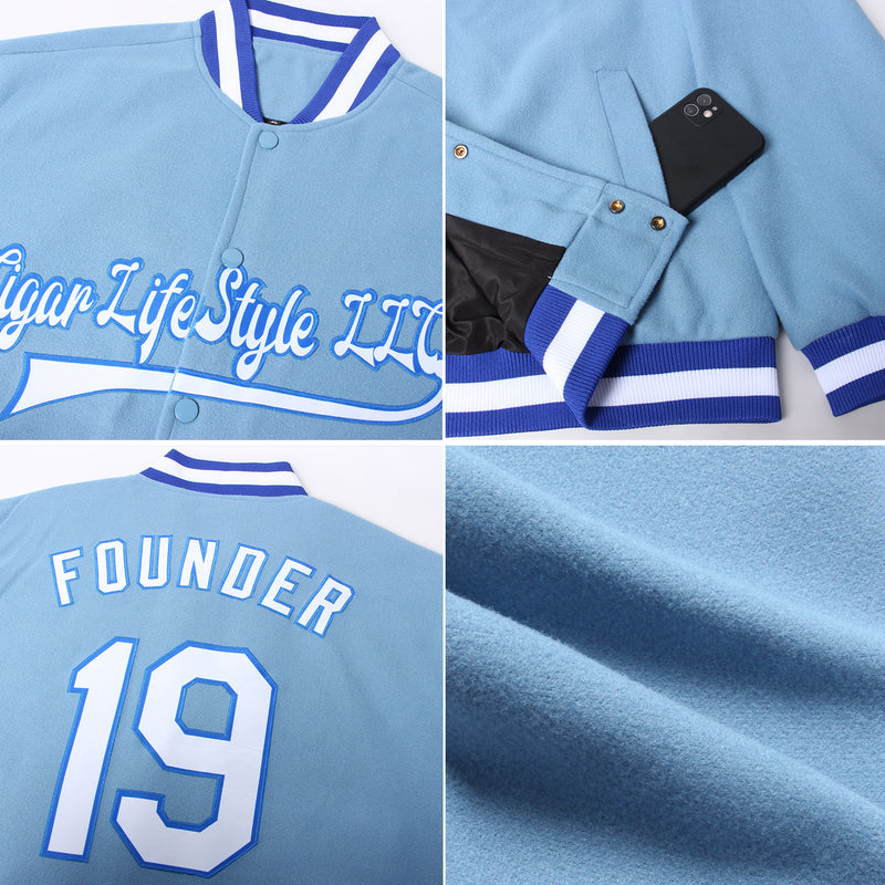 Custom Light Blue White-Royal Bomber Full-Snap Varsity Letterman Jacket