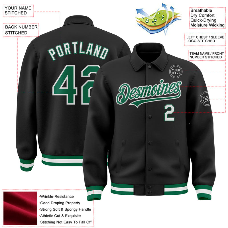 Custom Black Kelly Green-White Bomber Full-Snap Varsity Letterman Lapel Collar Byron Jacket