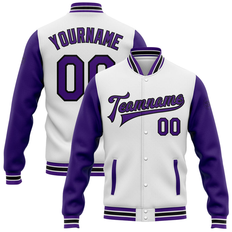 Custom White Purple-Black Bomber Full-Snap Varsity Letterman Two Tone Jacket