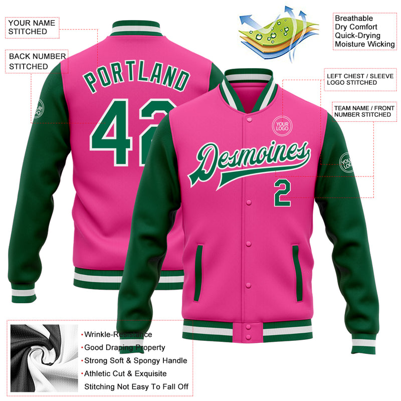 Custom Pink Kelly Green-White Bomber Full-Snap Varsity Letterman Two Tone Jacket