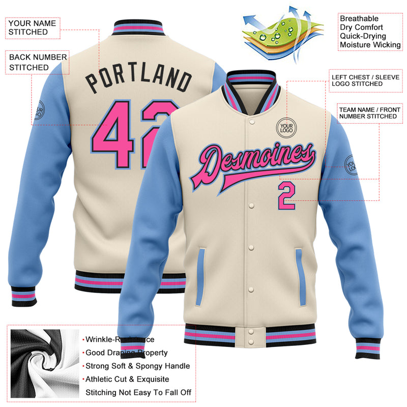 Custom Cream Pink Black-Light Blue Bomber Full-Snap Varsity Letterman Two Tone Jacket