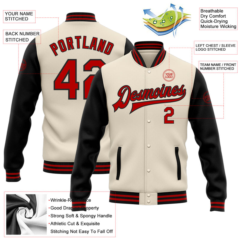 Custom Cream Red-Black Bomber Full-Snap Varsity Letterman Two Tone Jacket
