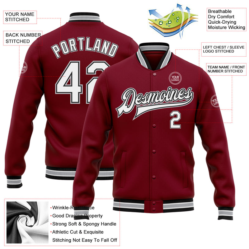 Custom Crimson White Black-Gray Bomber Full-Snap Varsity Letterman Jacket