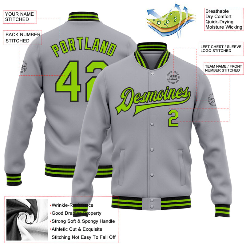 Custom Gray Neon Green-Black Bomber Full-Snap Varsity Letterman Jacket