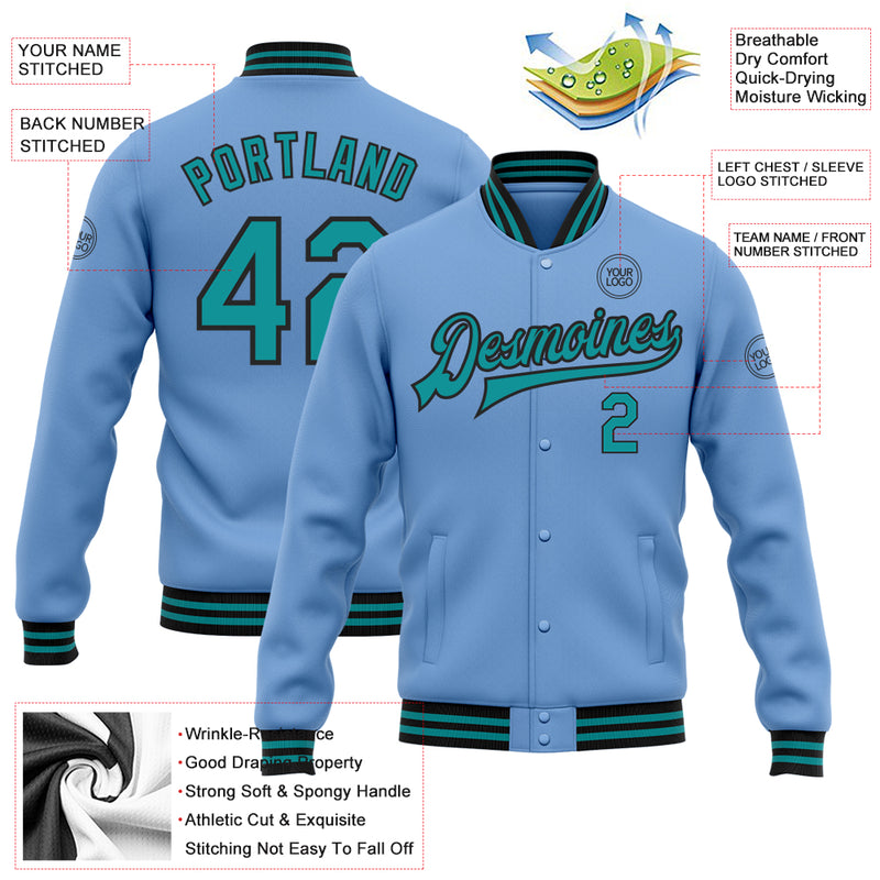 Custom Light Blue Teal-Black Bomber Full-Snap Varsity Letterman Jacket