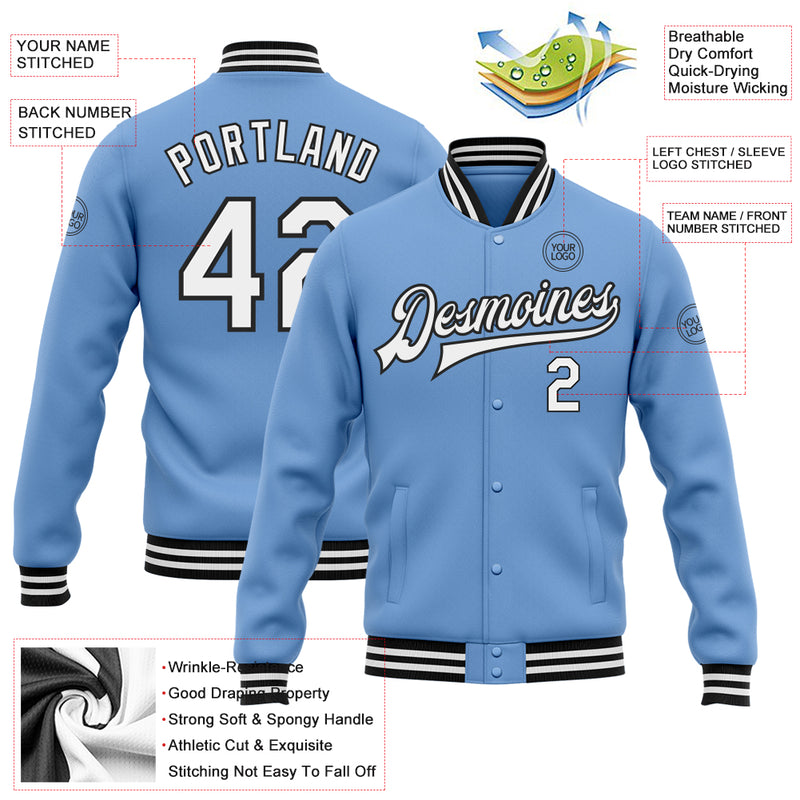 Custom Light Blue White-Black Bomber Full-Snap Varsity Letterman Jacket