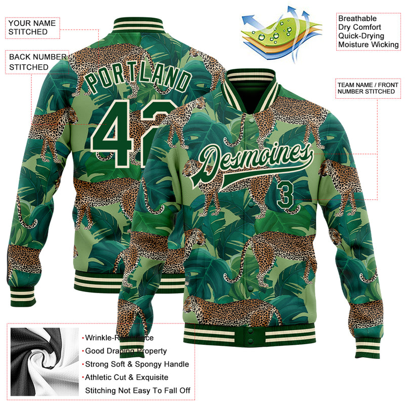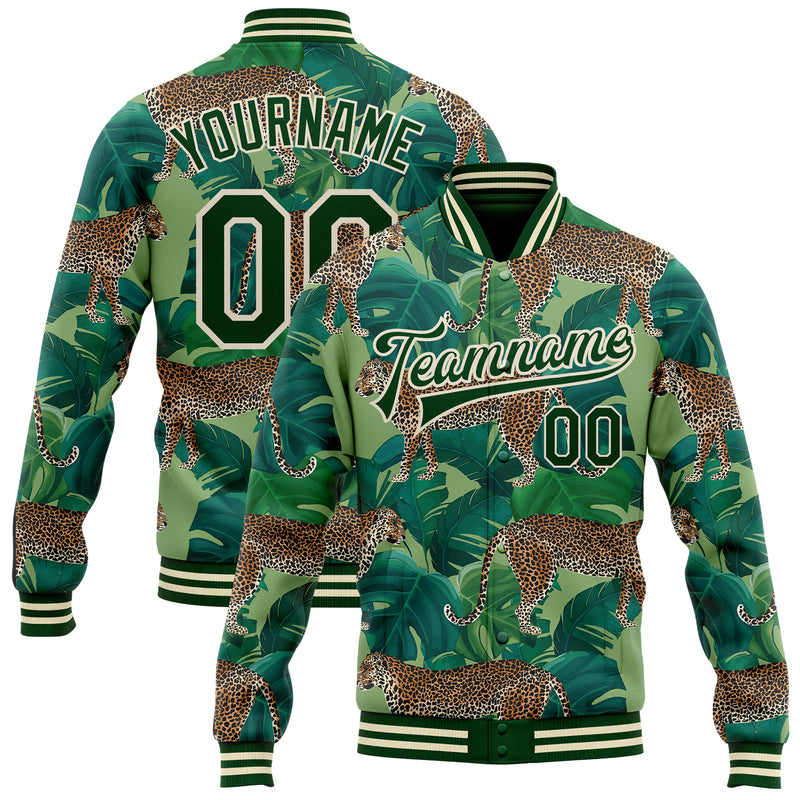 Custom Green Green-Cream Tropical Tiger With Palms 3D Pattern Design Bomber Full-Snap Varsity Letterman Jacket