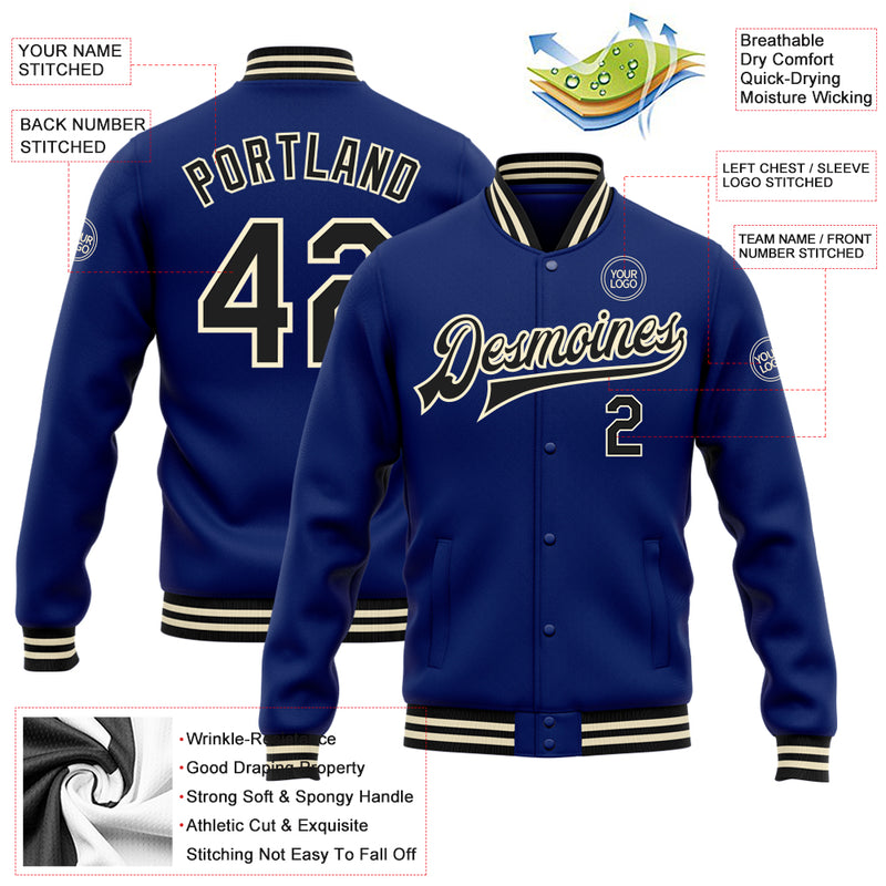 Custom Royal Black-Cream Bomber Full-Snap Varsity Letterman Jacket