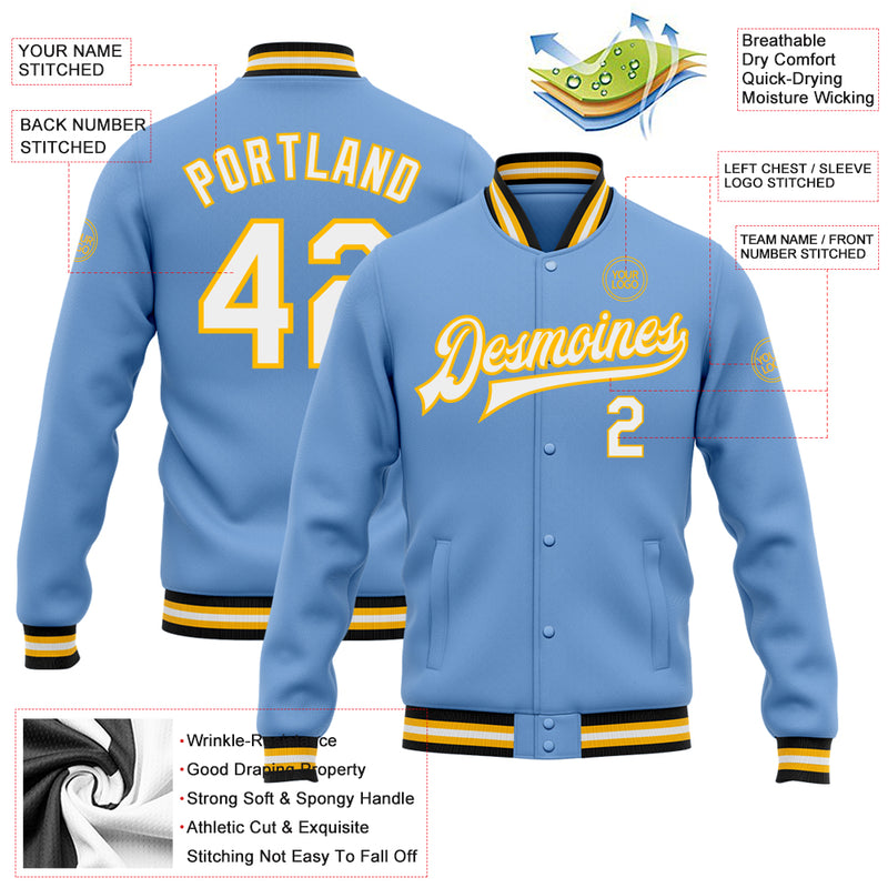 Custom Light Blue White Gold-Black Bomber Full-Snap Varsity Letterman Jacket