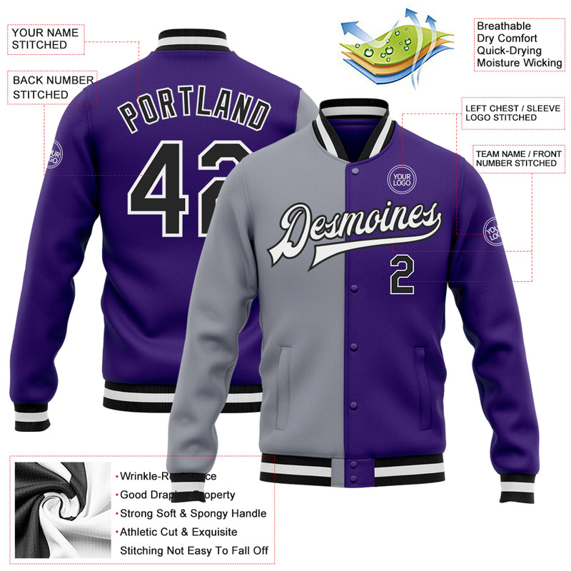 Custom Purple Black-Gray Bomber Full-Snap Varsity Letterman Split Fashion Jacket