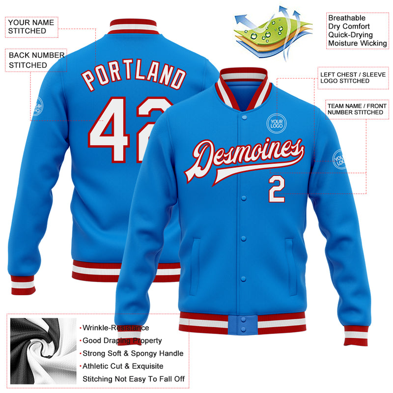 Custom Powder Blue White-Red Bomber Full-Snap Varsity Letterman Jacket