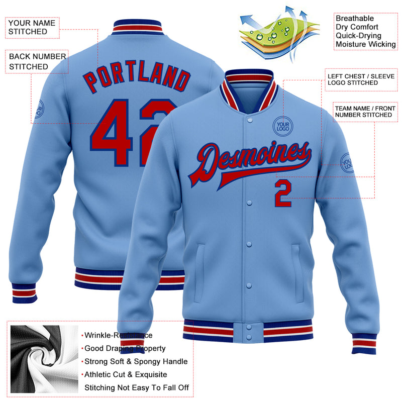 Custom Light Blue Red-Royal Bomber Full-Snap Varsity Letterman Jacket