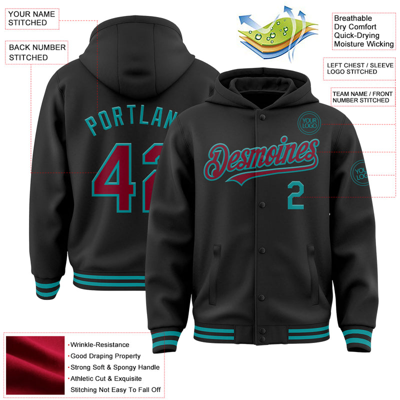 Custom Black Crimson-Teal Bomber Full-Snap Varsity Letterman Hoodie Jacket
