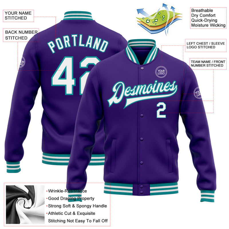 Custom Purple White-Teal Bomber Full-Snap Varsity Letterman Jacket