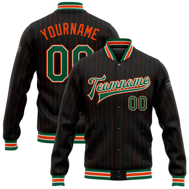 Custom Black Orange Pinstripe Kelly Green-White Bomber Full-Snap Varsity Letterman Jacket