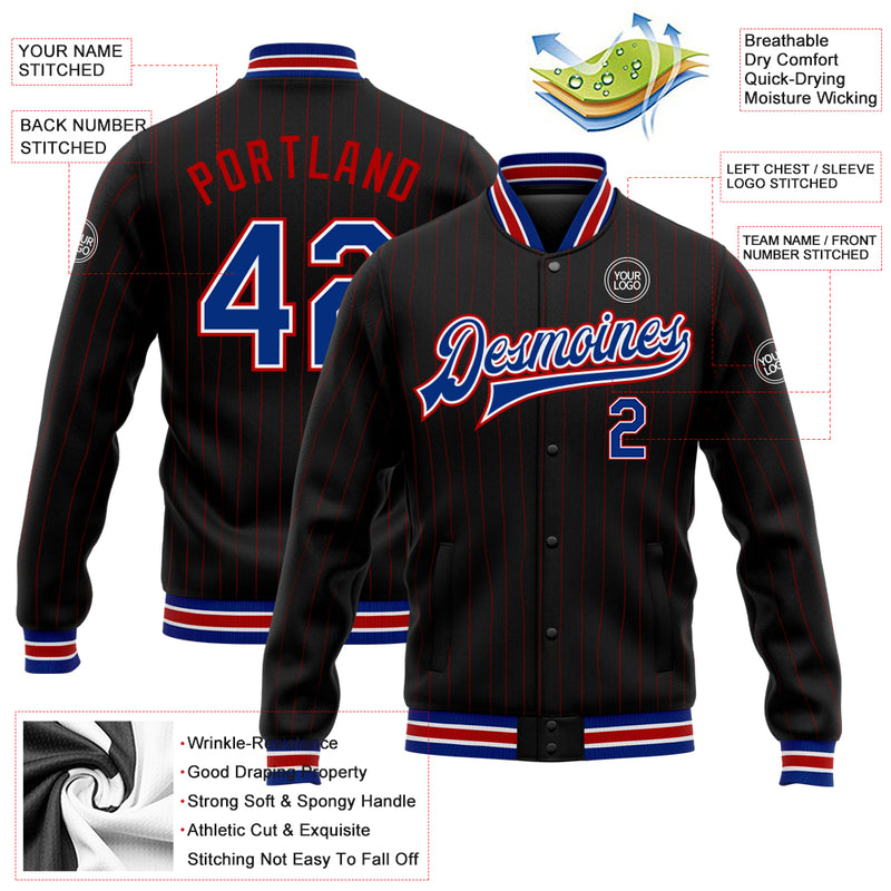 Custom Black Red Pinstripe Royal-White Bomber Full-Snap Varsity Letterman Jacket