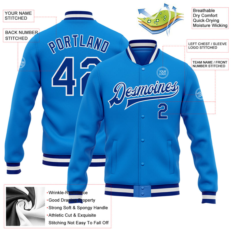 Custom Powder Blue Royal-White Bomber Full-Snap Varsity Letterman Jacket